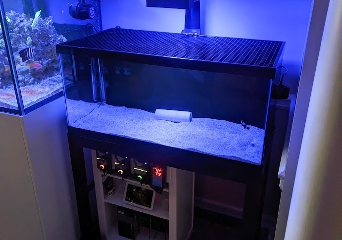 A mixed reef display plumbed into the main tank. Originally intended as a frag tank, accelerated growth has transitioned the system into a mixed reef display.